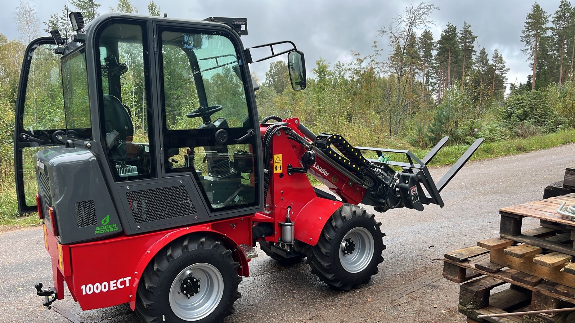 Tässä minikuormaajassa on 1000 kg:n nostokapasiteetti, mikä tekee esimerkiksi pellettilavan käsittelystä helppoa.